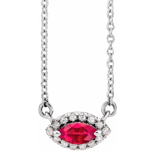 14k white gold marquise-cut ruby and diamond necklace has a spring ring clasp. Pendant size: 5.6mm x 9.5mm. 14k white gold cable chain length: 18in. 6mm x 3mm marquise-cut ruby, AA quality. 14 diamond accents, .06 carat total weight, I1 clarity, G-H color. French set diamonds. Item weight: 1.9 grams. Made in USA.