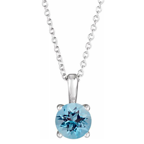 14k white gold 1/4 carat round aquamarine necklace has a spring ring clasp. Four prong setting. Pendant dangles from a 14k white gold adjustable 16in to 18in cable chain. Chain width: 1mm. Genuine round 4mm aquamarine, AA quality. Item weight: 2.0 grams.