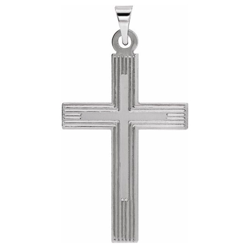 14k white gold Latin cross pendant has a lined design and polished finish. Item measures 5/8in x 1in without bail. Fits up to a 2.5mm wide chain. One of the oldest forms of the cross, the Latin cross is also the true form of the cross. Weight: 2.2 grams. Made in USA.