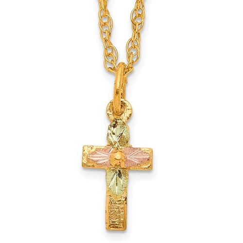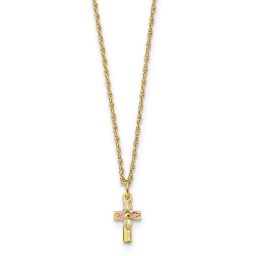 This tiny 10k Black Hills gold cross necklace has a spring ring clasp. Pendant size: 1/4in x 3/8in without bail. 10k yellow gold 18 inch ropa chain. Approximate weight: 1.3 grams. Gift boxed. Made in USA.