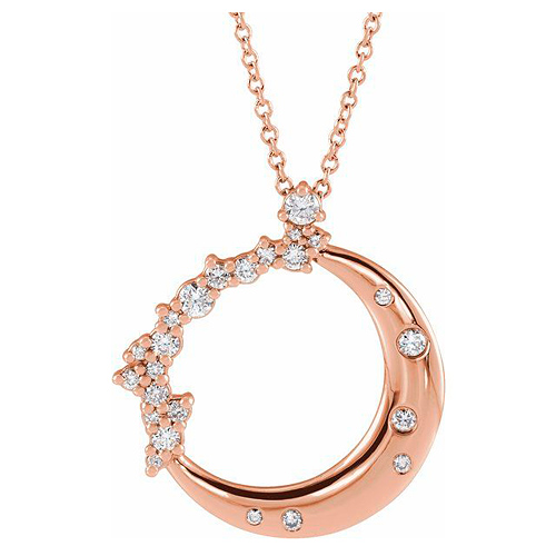 Diamond crescent moon and stars necklace is made of 14k rose gold. Pendant size: 3/4in x 7/8in with bail. 24 round full cut diamonds, .25 carat total weight, G-H color, I1 clarity. Prong and bezel set diamonds. 14k rose gold 16in to 18in adjustable cable chain has a spring ring clasp. Weight: 2.4 grams. Made in USA.