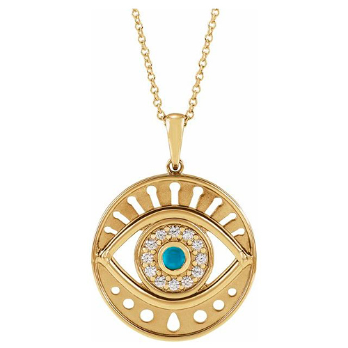 14k yellow gold turquoise and diamond evil eye necklace has a spring ring clasp. 3mm round cabochon turquoise. 12 round full-cut diamonds, I1 clarity, G-H color, .20 carat total weight. Pendant size: 3/4in x 3/4in without bail. 14k 14k gold cable chain is adjustable from 16 to 18 inches. Chain width: 1mm. Approximate weight: 6.2 grams. Made in USA.