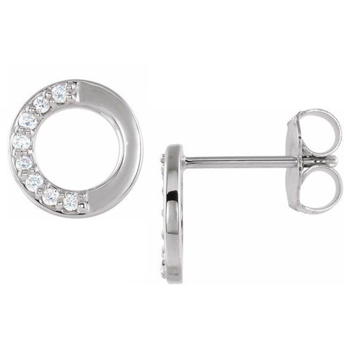 Diamond accents decorate one half of these 14k white gold open circle earrings. Earring size: 8.4mm. 16 round full cut diamonds, .08 carat total weight, G-H color, I1 clarity. Posts with frction backs. Weight: 1.4 grams. Made in USA.