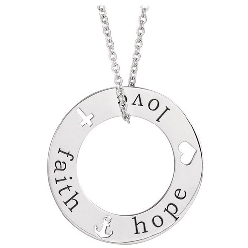 This round 14k white gold faith, hope and love necklace has pierced accents. The cross, heart and anchor represent faith, love and hope. Pendant size: 3/4in without bail. 14k yellow gold adjustable 16in to 18in cable chain has a spring ring clasp. Approximate weight: 3.5 grams. Made in USA.