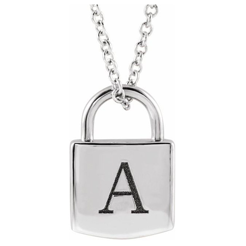 Engravable lock necklace is made of solid 14k white gold. Pendant height: 1/2in. Engrave a single initial. 14k white gold adjustable 16 to 18in cable chain has a spring ring clasp. Made in USA.