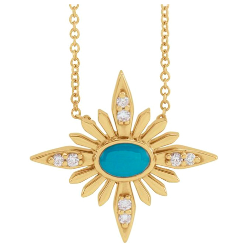 This award-winning 14k yellow gold turquoise celestial necklace has eight round diamond accents. Opal size: 6mm x 4mm. Genuine round full-cut diamonds, .08 carat total weight, G-H color and I1 clarity. Pendant size: 21mm x 19.6mm. 14k yellow gold adjustable 16in to 18in cable chain has a spring ring clasp. Approximate weight: 4.1 grams. Made in the USA.