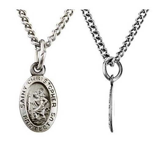 This tiny St Christopher medal necklace is made of sterling silver. Petite medal is half the size of a penny. Includes 18-inch sterling silver curb chain. Medal dimensions: 9mm x 5.75mm. The jump ring is 2.25mm x 2.25mm. This medal is plain on the back.