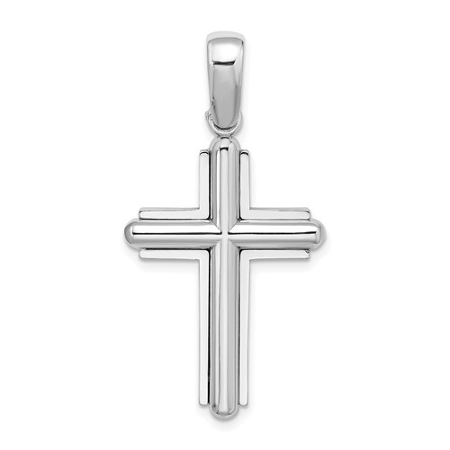 Solid 14k white gold beveled stick cross pendant has a polished finish. Measures 3/4in x 1in without bail. Weight: 6.2 grams. Open back. Fits up to a 6mm wide chain. Made in USA.
