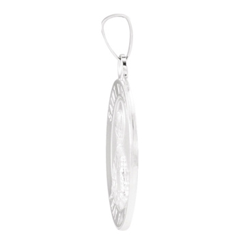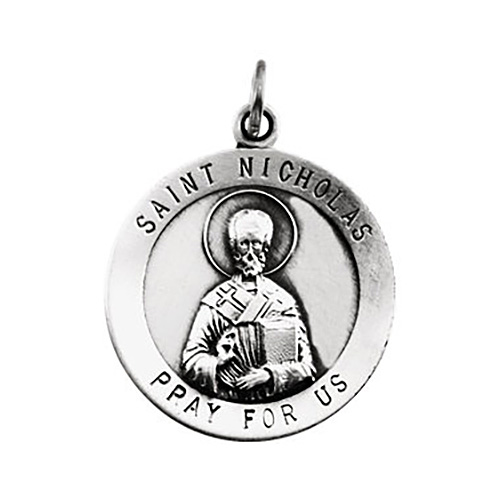 This round St Nicholas medal is made of polished 14kt white gold. 18.5mm in diameter. This item is slightly larger than a dime. Weighs 2.54 grams. Please note: weight is approximate, actual weight may vary. St. Nicholas is the popular patron saint of bakers and pawnbrokers.