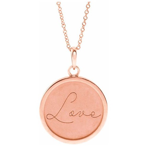 This laser engraved Love disc necklace is made of solid 14k rose gold. Pendant size: 18mm x 18mm. Bead blast and polished finish. 14k rose gold adjustable 16in to 18in diamond-cut cable chain has a spring ring clasp. Approximate weight: 4.4 grams. Made in the USA.