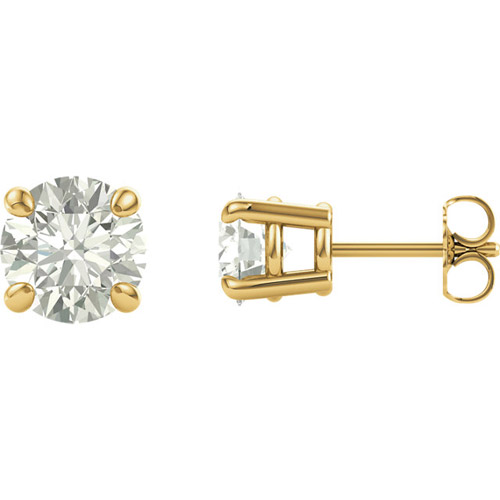 1 ct tw Forever One moissanite earrings are made of polished 14k yellow gold. Four prongs. Set with two 5mm round Forever One moissanite gemstones, E-F color and VS1-VS2 clarity. Friction backs. Approximate weight: 0.8 grams. Includes Charles & Colvard warranty card and certificate of authenticity. Made in the USA.