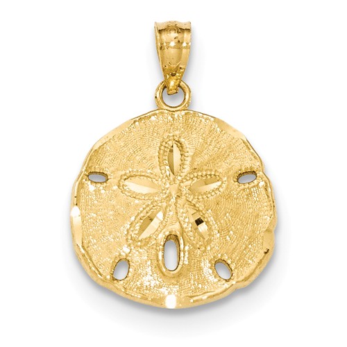 This small sand dollar pendant is made of 14k yellow gold. Item size: 5/8in x 5/8in. Textured back. Weight: 1.2 grams. Fits up to a 3.5mm wide chain. Made in USA.