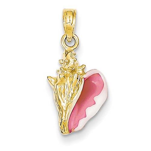 Pink enamel conch shell pendant is made of polished 14k yellow gold. Three dimensional. Item size: 5/8in x 3/8in. Fits up to a 3mm wide chain. Weight: 1.9 grams. Made in Peru.