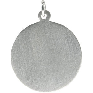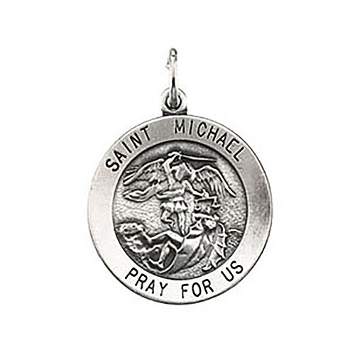 Polished solid sterling silver medal with 18-inch matching chain. Round, 18mm diameter. Inscription reads: SAINT MICHAEL PRAY FOR US. Weighs approximately 5.1 grams. Please note: weight is approximate, actual weight may vary. Made in USA.