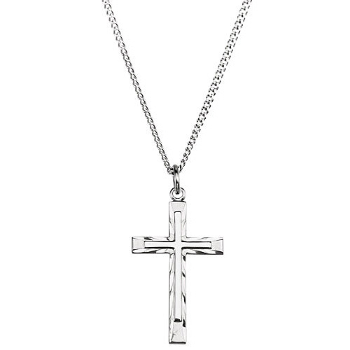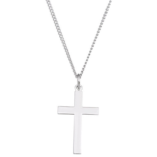 Polished sterling silver pendant with 18-inch chain. Cross dimensions: 25mm x 16mm. Weighs 4.29 grams. Please note: weight is approximate, actual weight may vary.