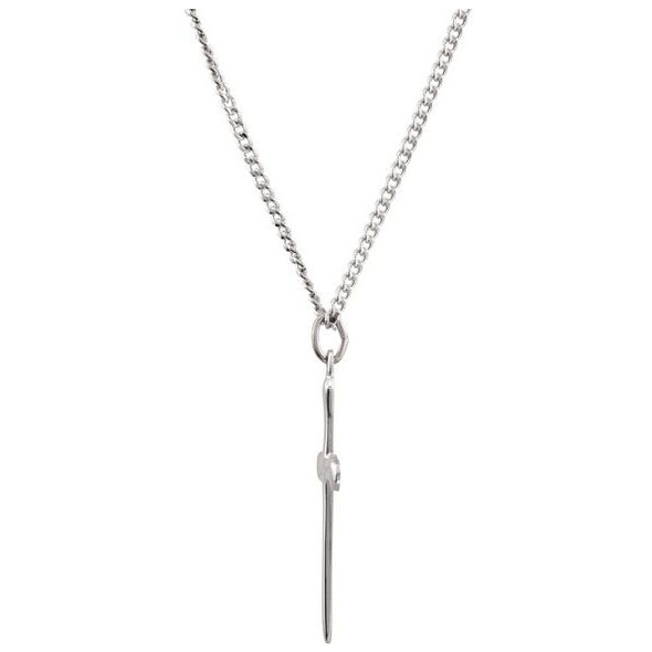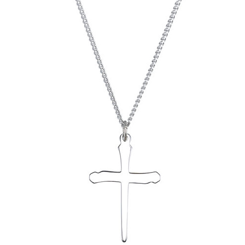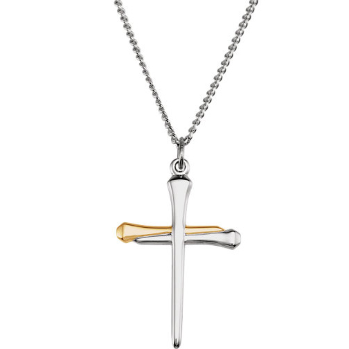 This men's polished gold-plated sterling silver nail cross pendant dangles from a sterling silver 24in endless cable chain [no clasp]. Pendant dimensions: 33mm x 23mm. Approximate weight: 9.64 grams. Ships from USA.