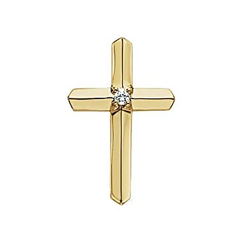 14k yellow gold cross pendant has one .03 CT (2mm) round diamond. 21.5x14mm. This item is approximately the size of a nickel. Diamond details: clarity SI, full cut. Weighs 0.98 DWT (1.52 grams). Please note: weight is approximate, actual weight may vary. Chain not included.