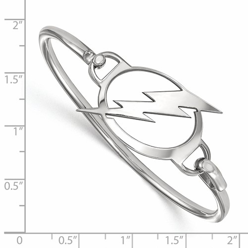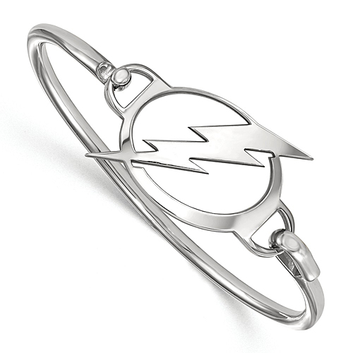 Tampa Bay Lightning bangle is made of polished sterling silver. Center plate length: 1 1/4in, width: 3/4in. Bracelet length: 7in. Hook clasp. Officially licensed jewelry. Weight: 15.1 grams. Made in the USA.