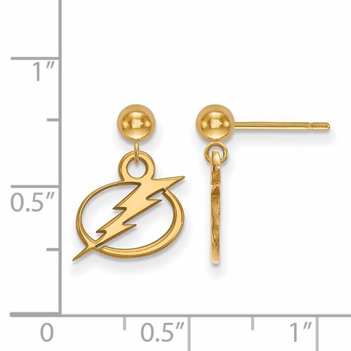These small Tampa Bay Lightning dangle ball earrings are made of polished 14k yellow gold. Earring height: 5/8in, width: 3/8in. Officially licensed jewelry. Weight: 0.8 gram. Made in the USA.
