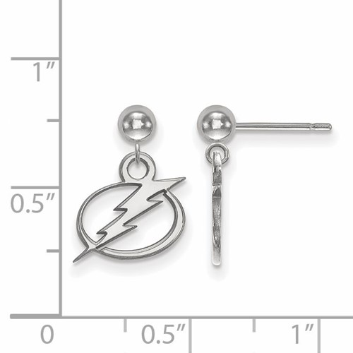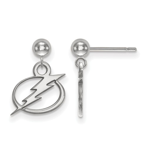 These small Tampa Bay Lightning dangle ball earrings are made of polished 14k white gold. Earring height: 5/8in, width: 3/8in. Officially licensed jewelry. Weight: 0.8 gram. Made in the USA.