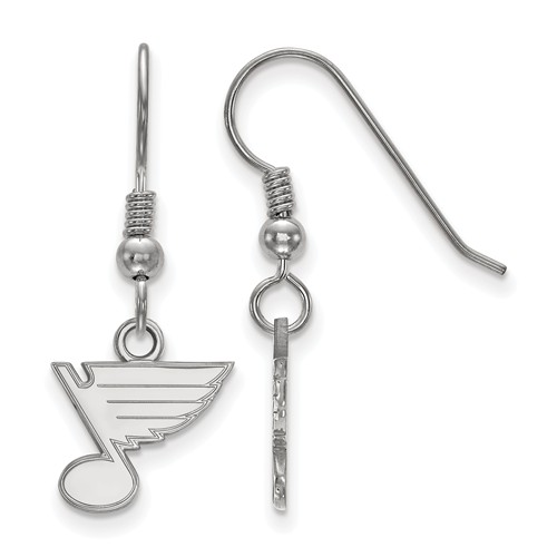 St. Louis Blues dangle earrings are made of polished sterling silver. Charm size: 3/8in x 3/8in. Earring length: 1 1/4in. Officially licensed jewelry. Fits up to a 5mm wide chain. Weight: 1.5 grams. Made in the USA.