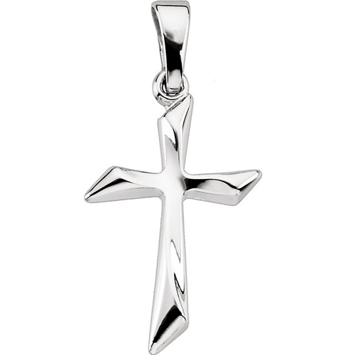 This ladies' 14kt white gold hollow angled cross pendant measures 18.5 mm by 13.00 mm and weighs 0.54 grams. This item is slightly larger than a dime. Fits up to a 3mm wide chain. Please note: weight is approximate, actual weight may vary. Chain not included.