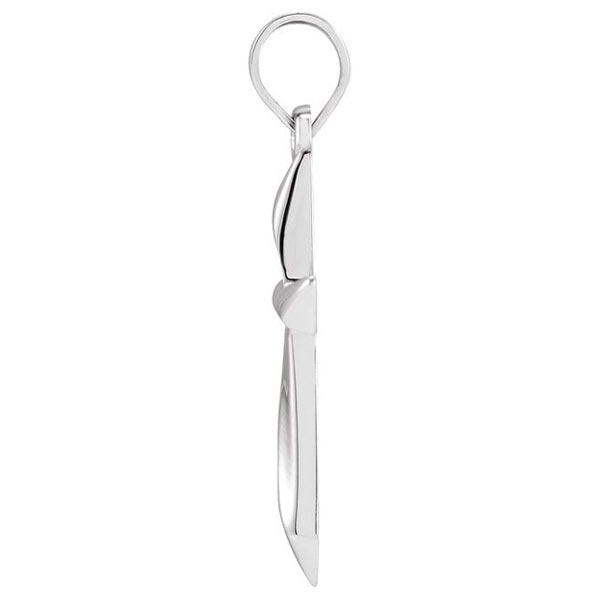 This 14kt white gold hollow cross pendant has angled tips. Item size: 25.5mm by 18.00 mm Bail dimensions: 2.75mm x 4.0mm. We recommend a chain no thicker than 2.25mm. Please note: weight is approximate, actual weight may vary. Chain not included. Weight: 0.87 grams.