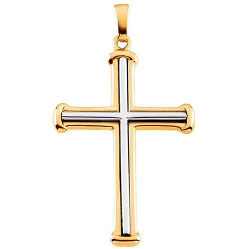 Large cross pendant is made of polished solid 14k two tone gold. Dimensions: 34.75mm x 24.5mm. This item is larger than a half dollar. Fits up to a 3.5mm wide chain. Finely detailed. Approximate weight: 4.51 grams.