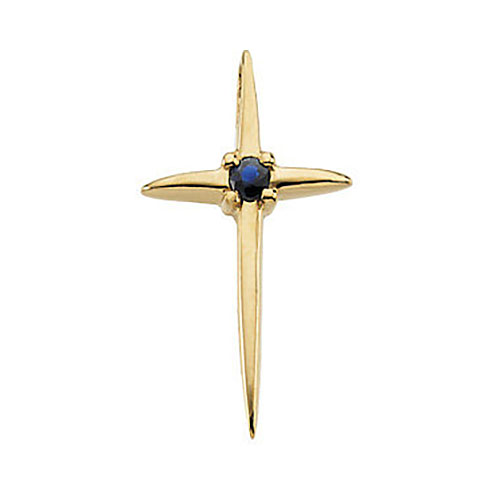 This ladies' sapphire cross pendant is made of polished 14kt yellow gold. Small cross pendant with hidden bail. Round sapphire is 2mm in diameter, .03 carat. Dimensions: 17.75mm x 10mm. This item is the size of a dime. Fits up to a 2.5mm wide chain. Weighs 0.67 grams.