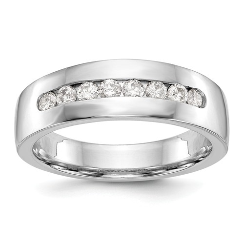 The men's 1/2 ct True Origin created diamond wedding band is made of polished 14k white gold. Channel set. Standard fit. Diamond details: eight lab grown diamonds, 1/2 carat total weight, 2.5mm round, color E-F, clarity VS2. Ring width: 9mm. Rhodium-plated. Approximate item weight: 8.4 grams. Import.
