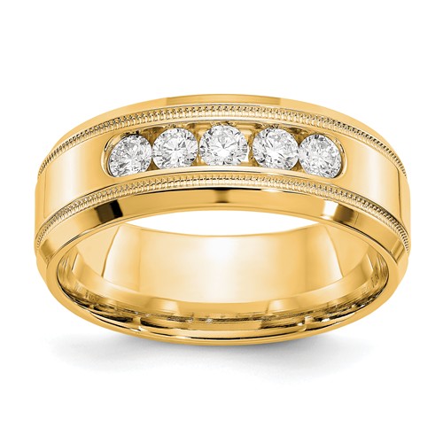 The men's 1/2 ct True Origin created diamond wedding band is made of polished 14k yellow gold. Beveled edges and milgrain design. Channel set. Diamond details: five lab grown diamonds, 1/2 carat total weight, 2.9mm round, color E-F, clarity VS2. Ring width: 10mm. Standard fit. Approximate item weight: 11.2 grams. Import.