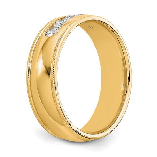 The men's 1/2 ct True Origin created diamond wedding band is made of polished 14k yellow gold. Milgrain edges and domed center. Channel set. Diamond details: five lab grown diamonds, 1/2 carat total weight, 2.9mm round, color E-F, clarity VS2. Ring width: 10mm. Rhodium-plated. Standard fit. Approximate item weight: 9.6 grams. Import.