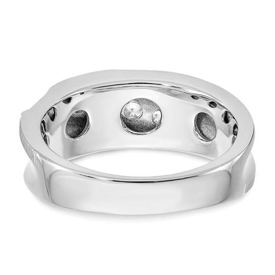 The men's 1/2 ct True Origin created diamond ring is made of polished 14k white gold. Brushed swirl design. Channel set. Diamond details: five lab grown diamonds, 1/2 carat total weight, color E-F, clarity VS2. Ring width: 11mm. Rhodium-plated. Standard fit. Approximate item weight: 10.8 grams. Import.