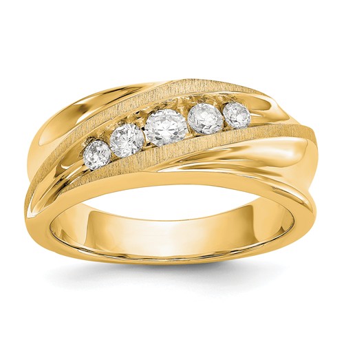 The men's 1/2 ct True Origin created diamond ring is made of polished 14k yellow gold. Brushed swirl design. Channel set. Diamond details: five lab grown diamonds, 1/2 carat total weight, color E-F, clarity VS2. Ring width: 11mm. Rhodium-plated. Standard fit. Approximate item weight: 10.8 grams. Import.