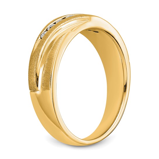 The men's 1/4 ct True Origin created diamond ring is made of polished 14k yellow gold. Brushed swirl design. Channel set diamonds of various sizes. Diamond details: seven lab grown diamonds, 1/4 carat total weight, color E-F, clarity VS2. Ring width: 9mm. Rhodium-plated. Standard fit. Approximate item weight: 7.8 grams. Import.