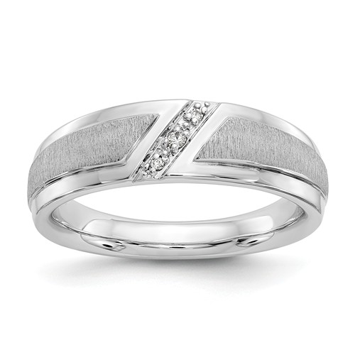 The men's .05 ct True Origin created diamond ring is made of brushed and polished 14k white gold. A row of three diamonds is prong set. Diamond details: three lab grown diamonds, .05 carat total weight, 1.4mm and 1.6mm round, color E-F, clarity VS2. Rhodium-plated. Standard fit. Approximate item weight: 8.1 grams. Made in USA.