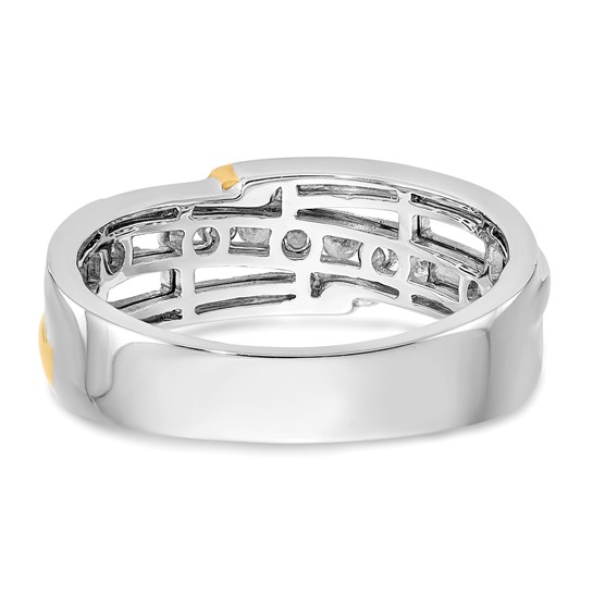 The men's 1/4 ct True Origin created diamond band is made of polished 14k two-tone gold. It features a row of lab grown diamonds, all are channel set. Diamond details: seven lab grown diamonds, 1/4 carat total weight, 2.2mm round, color E-F, clarity VS2. Ring width: 10mm. Rhodium-plated. Standard fit. Approximate item weight: 7.8 grams. Made in USA.