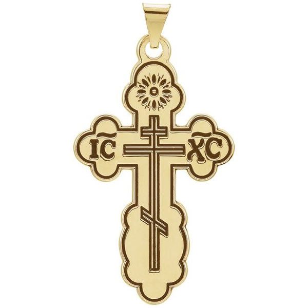 Polished 14kt yellow gold orthodox cross with black inlay. Dimensions: 32x21mm. Weighs 3.19 grams. Please note: weight is approximate, actual weight may vary. Chain not included.