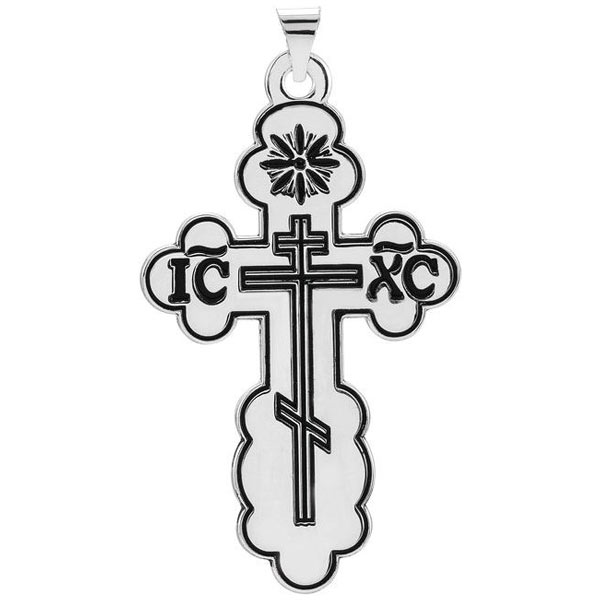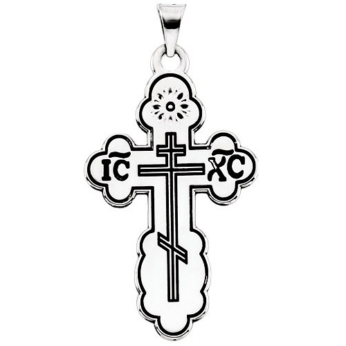 This men's white gold orthodox cross pendant has black enamel. Dimensions: 1in x 1.5in without bail. Fits up to a 3mm wide chain. Approximate weight: 4.79 grams. Please note: weight is approximate, actual weight may vary. Made in USA.