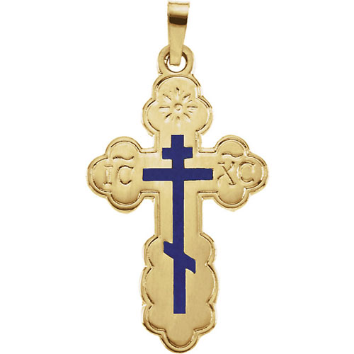 Polished solid 14k yellow gold orthodox cross is large enough to be worn by a man or a woman. Bluefire enamel on front. Protect and Save is inscribed on the back in Russian. Dimensions: 26x17mm. Weighs 2.16 grams. Please note: weight is approximate, actual weight may vary. Chain not included. Made in USA.