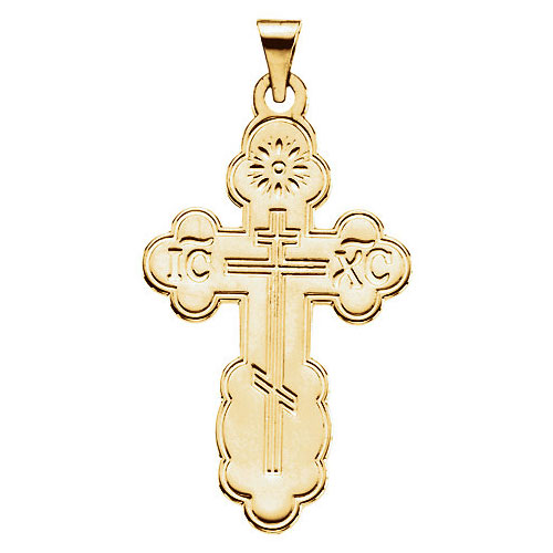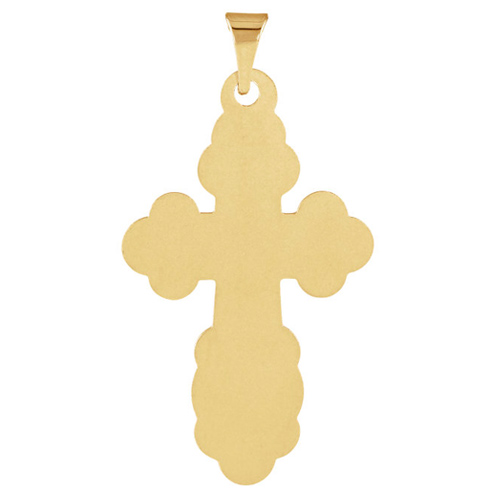 This solid 4k yellow gold orthodox cross is die struck and has a smooth blank back. Dimensions: 32mm x 21mm. Weighs 3.19 grams. Please note: weight is approximate, actual weight may vary. Bail size: 2.7 x 3.5mm. We recommend a chain no thicker then 2.5mm.