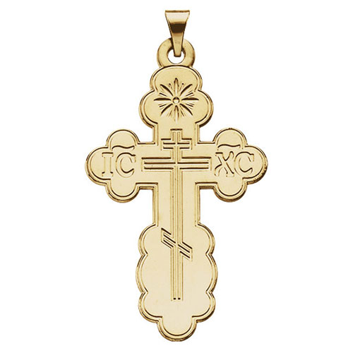 Large die struck orthodox cross pendant is made of polished solid 14k yellow gold. Dimensions: 40mm x 26mm without bail. Weighs 4.79 grams. Please note: weight is approximate, actual weight may vary. Chain not included. Bail size: 4.0 x 4.5mm. We recommend a chain no thicker then 3.5mm.