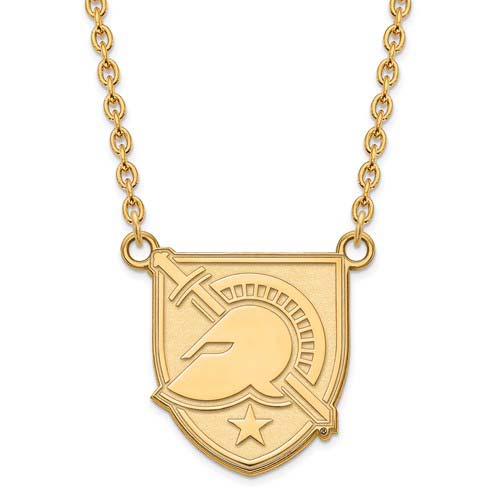 This US Military Academy at West Point pendant with chain is made of polished 14k yellow gold. Block A pendant height: 3/4in, width: 5/8in. Cable chain length: 18in. Officially licensed jewelry. Made in the USA.
