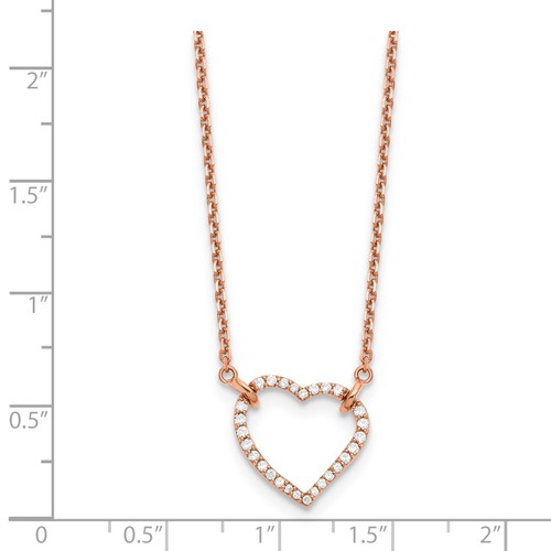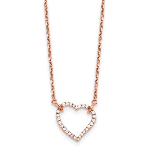 14k rose gold 2/5 ct lab grown diamond heart pendant dangles from a 14k rose gold 18in cable chain with lobster clasp. Diamond details: round lab grown diamonds, color E-F, clarity VS2. Pendant size: 14.1 x 14.8mm, slightly smaller than a dime. Approximate item weight: 2.4 grams. Import.