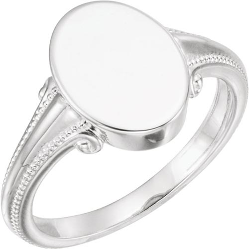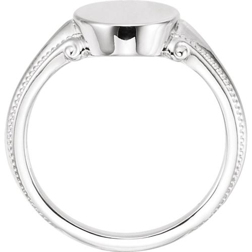 This ladies' 14k white gold oval signet ring has bead accents along the shank. Signet area: 9.65mm x 13mm. Open back. Average item weight: 5.9 grams. Made in the USA. Please note: weight is approximate, actual weight may vary.