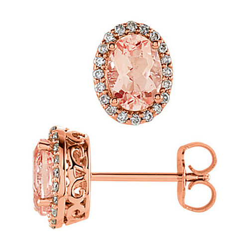 1.6 carat oval morganite and diamond halo earrings are made of 14k rose gold. Morganite details: oval 7mm x 5mm, .86 ct each, pink color. 1/5 ct tw round diamond accents, 40 x 1mm, G-H color, I1 clarity. Friction backs. Earring size: 9.3mm x 7.2mm. Average item weight: 1.6 grams. Please note: weight is approximate, actual weight may vary. Made in the USA.