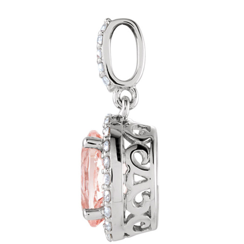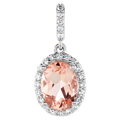 1.2 carat oval morganite and diamond halo pendant is made of 14k white gold. Morganite details: oval 8mm x 6mm, pink color. 1/6 ct tw round diamond accents, G-H color, I1 clarity. Pendant size: 18.7mm x 8.4mm including bail. Average item weight: 1.0 gram. Please note: weight is approximate, actual weight may vary. Made in the USA.