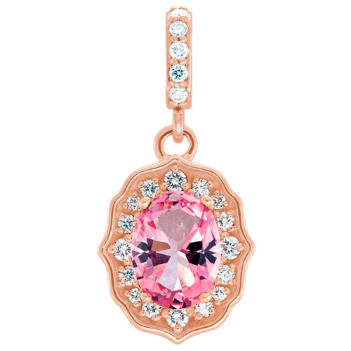 1.6 carat oval baby pink topaz and diamond halo pendant is made of 14k rose gold. Swarovski baby pink topaz details: oval 8mm x 6mm. 1/6 ct tw, 21 round diamond accents, G-H color, I1 clarity. Pendant size: 22mm x 10.8 mm. Average item weight: 2.3 grams. Please note: weight is approximate, actual weight may vary. Made in the USA.