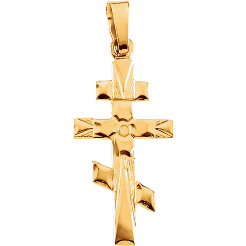 This ladies' St. Andrew orthodox cross pendant is made of solid 14k yellow gold. Size: 20mm x 10mm. Saint Andrew is the patron saint of elderly maids, fishermen, Greece, Russia and Scotland. Weighs 0.70 grams. Please note: weight is approximate, actual weight may vary. Chain not included.