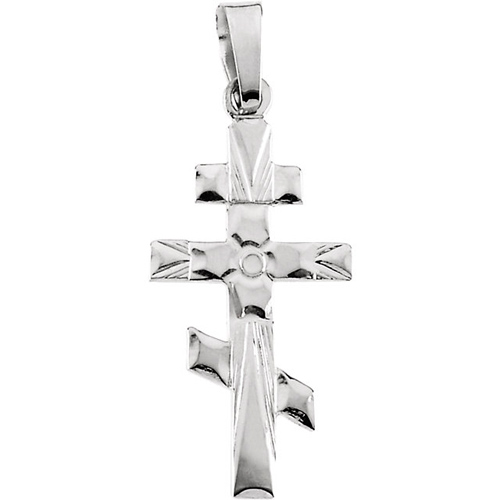 Polished solid 14k white gold orthodox cross pendant. Item size: 32mm x 18mm. Saint Andrew is the patron saint of elderly maids, fishermen, Greece, Russia and Scotland. Weighs 1.60 grams. Please note: weight is approximate, actual weight may vary. Chain not included. Bail dimensions: 2.7mm x 3.75mm. We recommend a chain no wider than 2mm for this cross.